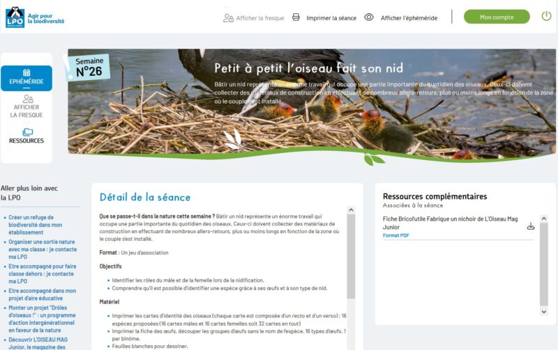 A travers 36 séances -une par semaine de cours-, la plateforme propose des sujets qui peuvent être abordés partout en France : « nous n’avons pas souhaité présenter d’espèces ou milieux spécifiques, afin que tous les élèves, où qu’ils habitent, puissent participer aux séances » explique Jihane Hafa, responsable de projets éducation à l’environnement à la LPO. Les séances ont été conçues pour réaliser des observations faciles à faire pour les enfants, en lien avec la saison du moment.